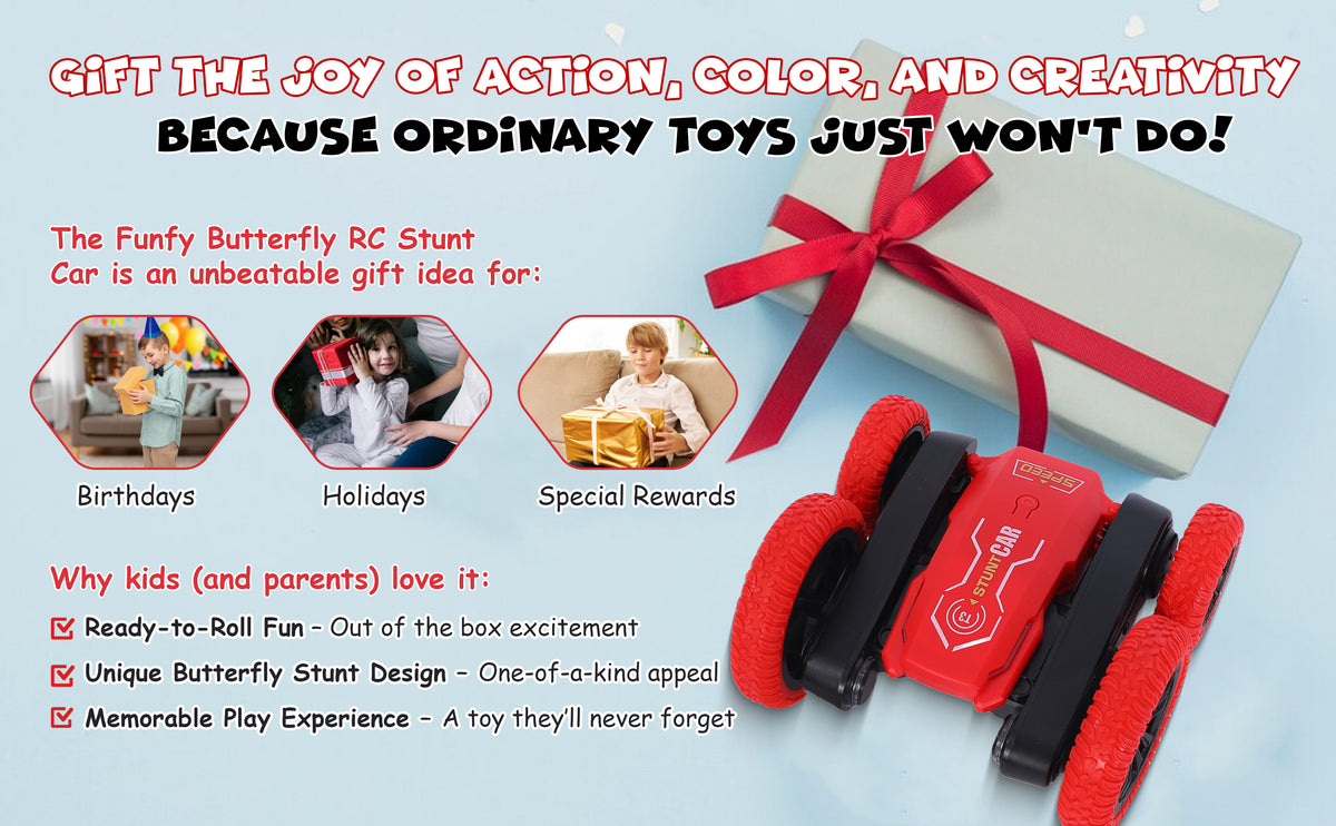 FUNFY 4WD High-Speed RC Butterfly Stunt Toy Car | Assorted | With 360° Flat and V Shape Rotation, Double Side Drive | Anti-Slip Shock Proof Tyres | Displaying Various Messages for Kids