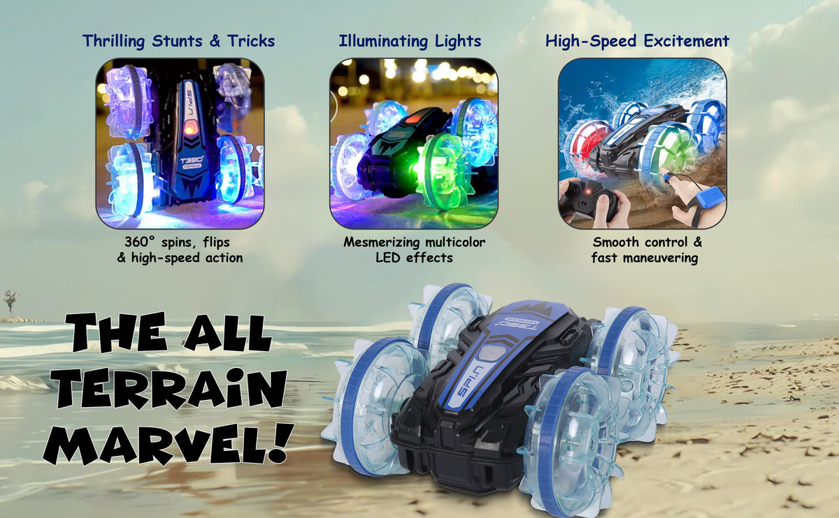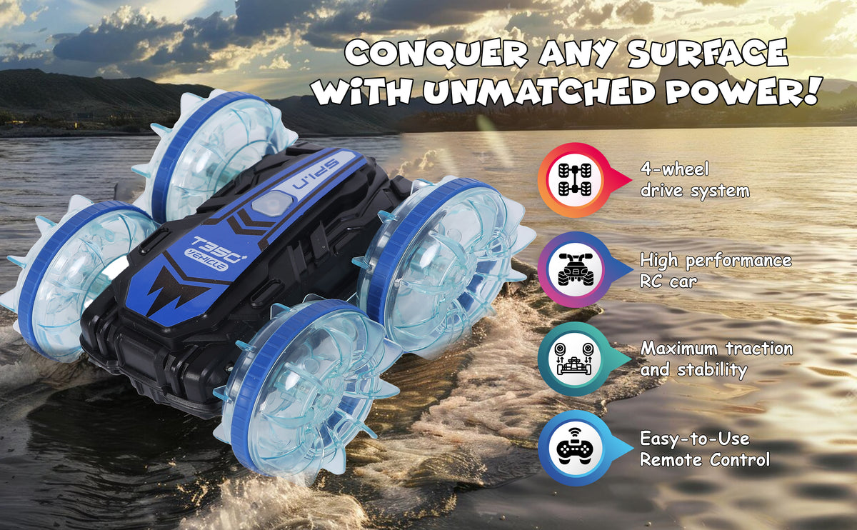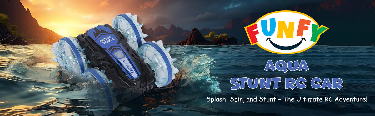 - AQUA STUNT RC CAR: The Funfy Aqua Stunt RC Car is designed for thrilling stunts and high-speed action, capable of performing impressive tricks both on land and in water.