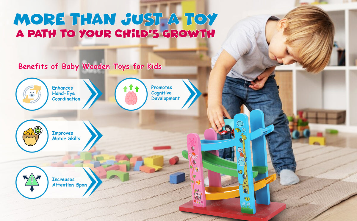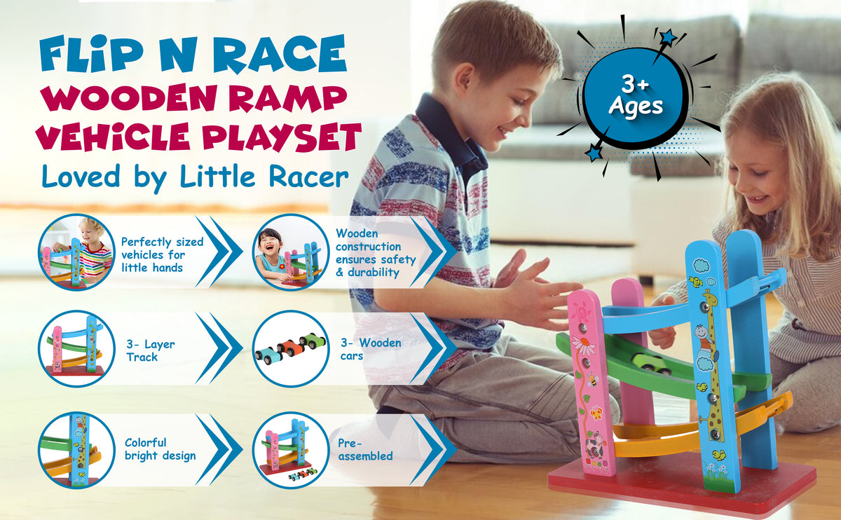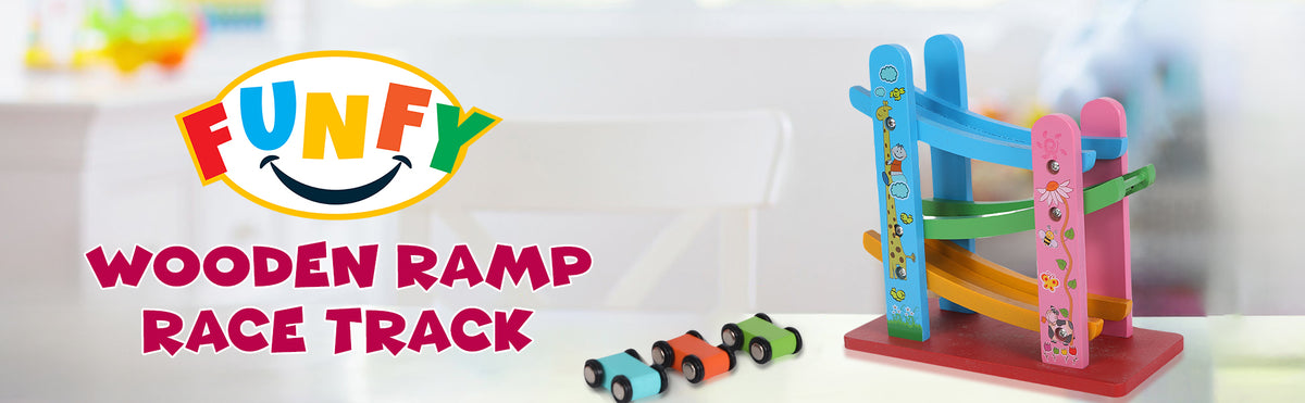 FUNFY Wooden Ramp Race Track Cars Game With 3 Mini Cars | Multicolor | Material: Wood | Tabletop Montessori Toy for Developing Creativity | Vibrant Design, Fine-Quality | For Kids
