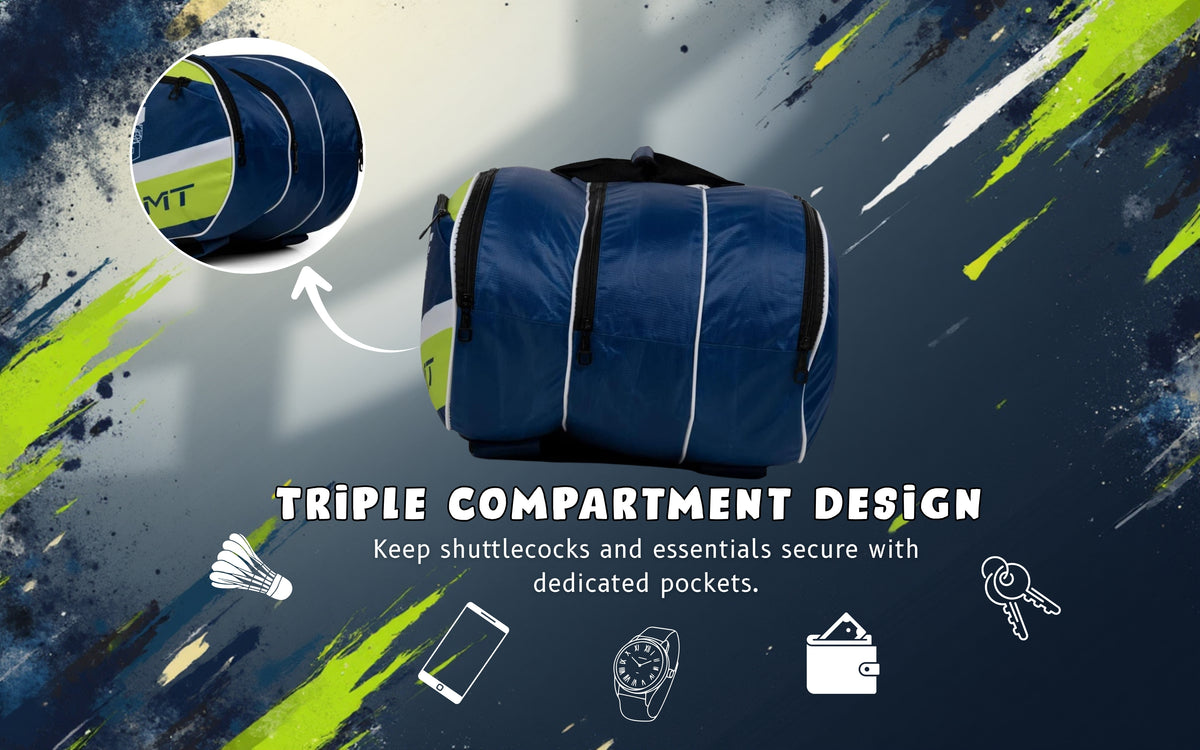 - Triple Compartment Design: Equipped with three spacious compartments, the bag allows for organized storage of rackets, accessories, and other essentials, ensuring easy access during training and tournaments.