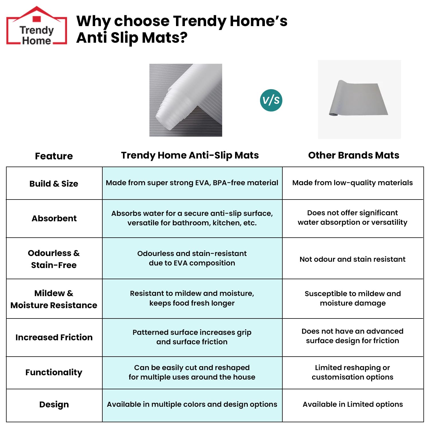 - Build & size: Made from super strong EVA, these anti-slip mats are extremely durable and are BPA free. Size: 45 cm x 5 m roll.